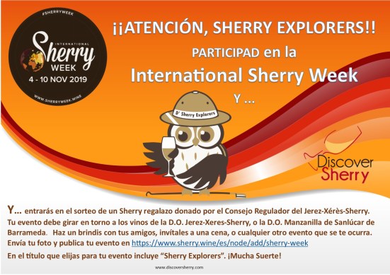 Os animamos a todos los Sherry Explorers del mundo mundial a participar en la International Sherry Week. Es muy fácil y puedes ganar un sherry regalo. Haz algo relacionado con el Vino de Jerez o Manzanilla de Sanlúcar. Reúne a algunos amigos y brinda por la International Sherry Week. Organiza una reunión o cena, reuniros en algún sitio típico de tu ciudad. Si es con nuestra mascota, EDU, mejor!! Os lo adjunto. Toda la información en este enlace: Crear evento Sherryweek